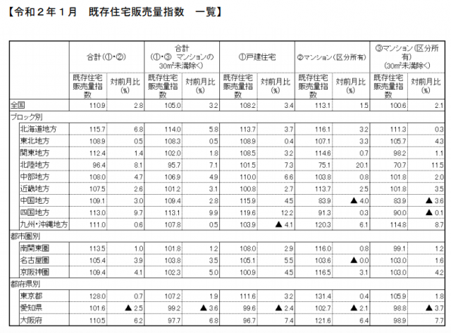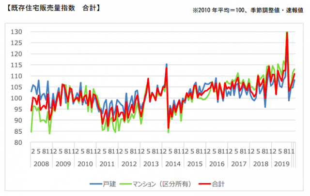 同日公表した2019年の「既存住宅販売量指数」(全国合計)は、戸建て住宅とマンションの合計が前年比4.0%増の110.0、30m2未満のマンションを除く合計が同3.8%増の104.3。2020年1月の同指数(季節調整値)は、戸建て住宅とマンションの合計が前月比2.8%増(前年同月比0.3%増)の110.9、30m2未満のマンションを除く合計が同3.2%増(同0.3%減)の105.0だった。