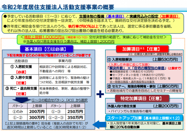 同事業では、住宅確保要配慮者の民間賃貸住宅等への入居の円滑化に係る活動(マッチング・入居支援等)を行う居住支援法人に対して、国がその活動に要する費用を補助する。補助上限額は1000万円。補助率は10分の10。交付決定額の範囲で、実績に応じて補助金を交付する。