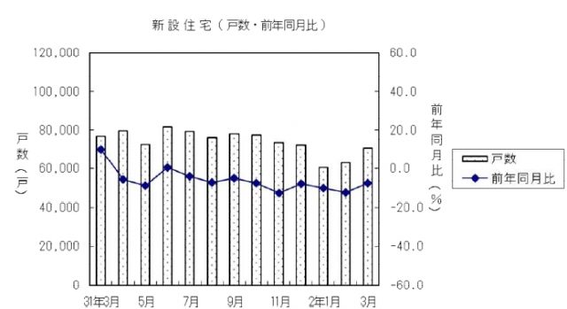 国交省によると新型コロナウイルスの影響は持家着工にはまだ大きく出ておらず、4月以降の動きが注目されるという。分譲住宅は16.1%減の2万1220戸で5カ月連続の減少。うち戸建ては1.0%減の1万1616戸で4カ月連続減少、マンションは28.7%減の9500戸で2カ月ぶりの減少となった。貸家は6.6%減の2万6545戸で19カ月連続の減少。アパートローン厳格化などの影響が続いている。季節調整済年率換算値は前月比3.9%増の90万5000戸で2カ月連続増となった。