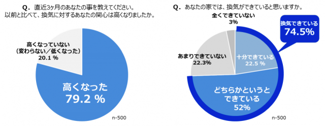 「直近3カ月で、以前と比べて、換気に対する関心は高くなりましたか」と質問したところ、「高くなった」との回答が79.2%。また、「あなたの家では、換気ができていると思いますか」との質問では「十分できている」「どちらかというとできている」との回答が合計74.5%となった。これらの結果について、同社は「コロナ禍での『換気』への関心の高さがうかがえる」と指摘した。