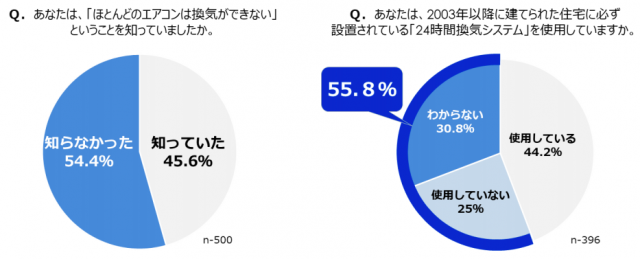 一方、「2003年以降に建てられた住宅に必ず設置されている『24時間換気システム』を使用していますか」と質問したところ、「使用していない」「わからない」との回答が合計55.8%。また、「『ほとんどのエアコンは換気ができない』ということを知っていましたか」という質問では、「知らなかった」との回答が54.4%だった。さらに、「上手な換気の方法を知りたいと思いますか」という質問に対して77.5%が「はい」と回答した。