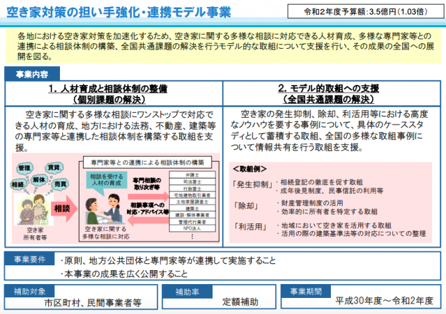 国土交通省は5月1日、全国の空き家対策を一層加速化させるための支援制度「空き家対策の担い手強化・連携モデル事業」の提案募集を開始した。