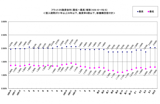 住宅金融支援機構(東京都文京区)が5月1日発表した、各金融機関の長期固定金利住宅ローン「フラット35」の5月分の金利は、主力の融資率9割以下・借入期間21年以上の場合で、年1.30~年2.03%だった。最低金利は前月並みだった。