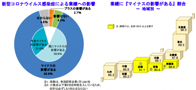 帝国データバンク(TDB、東京都港区)は5月1日、新型コロナウイルス感染症に対する企業の見解についての3回目の調査(調査期間=4月16日~30日)の結果を発表した。新型コロナによる自社の業績への影響について、『マイナスの影響がある』と見込む企業は88.8%となり、3月の調査(80.3%)から8.5ポイント増加した。