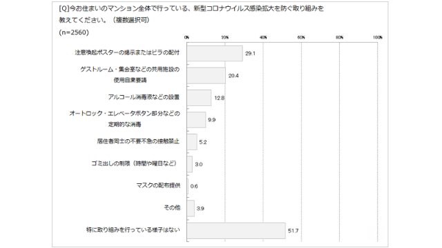 つなぐネットコミュニケーションズ(東京都千代田区)はこのほど、同社が運営するマンション居住者向け情報サイト「マンション・ラボ」の会員に対し、「マンションにおける新型コロナウイルス感染対策」に関する調査を実施し、その結果を発表した。居住しているマンション全体で行っている感染拡大防止の取り組みについて尋ねたところ、51.7%が「特に取り組みを行っている様子はない」と回答した。取り組んでいることとしては、「注意喚起ポスターの掲示またはビラの配布」(29.1%)、「有施設の使用自粛要請」(20.4%)、「アルコール消毒液などの設置」(12.8%)などが挙げられた。