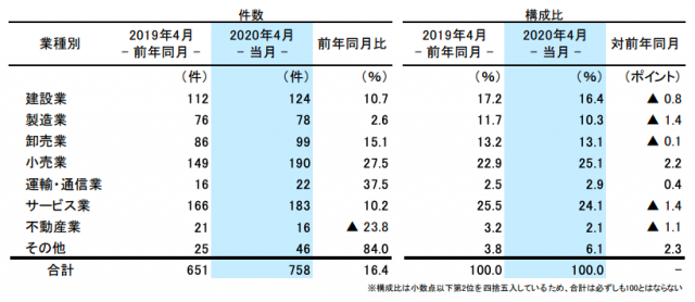 帝国データバンク(TDB、東京都港区)は5月13日、「全国企業倒産集計」(2020年4月報)を発表した。倒産件数は前年同月比16.4%増の758件で、8カ月連続の前年同月比増加。負債総額は同54.3%増の1614億6700万円で2カ月連続の前年同月比増加となった。