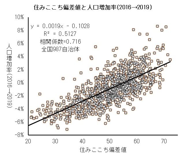 (3)は住み心地の良さと人口増加には深い関係があるとし、30人以上の回答が得られた全国987自治体の人口増加率と住み心地の偏差値を下記のグラフで示した。