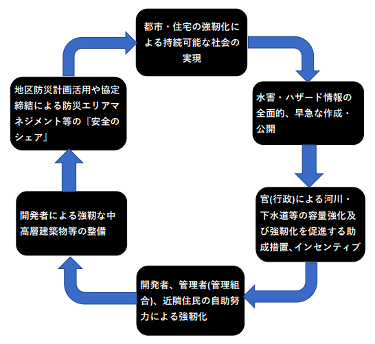 同報告書では、2019年東日本台風(台風19号)で中高層建築物等が被災し、⾧期間にわたって居住・使用できない事態が発生するなどの問題が顕在化したことを受け、開発者・管理者(管理組合)、近隣住民等、官(行政)の各主体の立場における課題と強靭化に向けた具体策を提示。その上で、「各主体による公共性のある強靭化策を、官(行政)がスピーディかつ積極的に後押しすること」、「各主体の連携強化・協力による防災・減災の共助(「安全のシェア」)」、「各主体の責任の明確化、具体的な運営条件の明確化の検討」の必要性を指摘している。