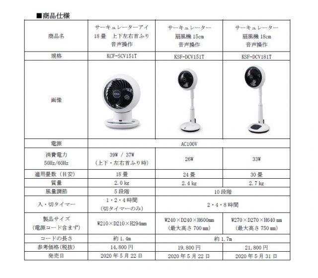 アイリスオーヤマ(仙台市)は、無線LAN環境やスマートスピーカー、スマホアプリがなくても音声操作ができる空気循環器「音声操作サーキュレーターアイ」1機種と「音声操作サーキュレーター扇風機」2機種を5月22日から順次発売する。