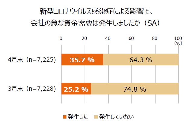 エヌエヌ生命保険(東京都渋谷区)はこのほど、2回目となる「新型コロナウイルスによる中小企業の資金需要に関する調査」を実施し、その結果を発表した。新型コロナウイルス感染症の影響で会社の急な資金需要が「発生した」割合は35.7%。3月末に実施した第1回調査と比較して10ポイント増加した。資金繰り策として最も多かったのは「公的機関からの融資」(28.4%)。次いで多かった回答は「社長自身や会長など役員からの借入(役員借入金)」(15.9%)で、金融機関からの融資より高い結果となった。