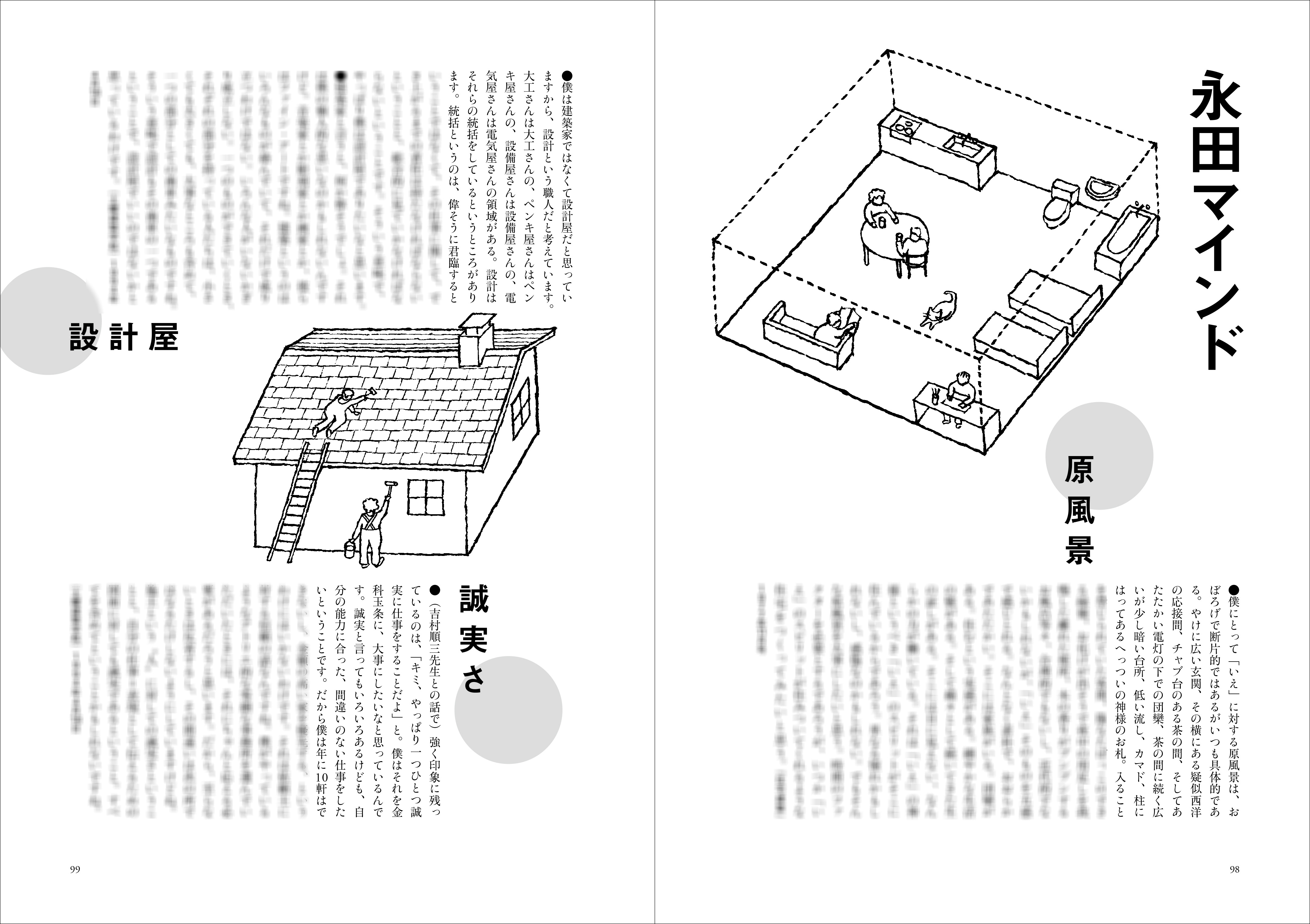 「新建ハウジングプラスワン」の連載と、手記やセミナー記録などに残された永田語録、自筆のイラスト、建築家対談から、建築家・永田昌民の軌跡を追う。