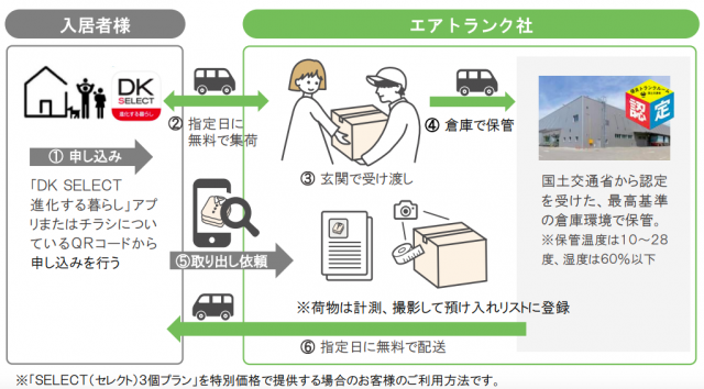 大東建託(東京都港区)は6月1日、宅配型トランクルーム『エアトランク』を運営するエアトランク(東京都千代田区)と協業し、大東建託グループ各社を利用する客限定で、指定品目から何でも3個まで預けられる宅配型トランクルームサービス「SELECT(セレクト)3個プラン」を特別価格で提供開始する。