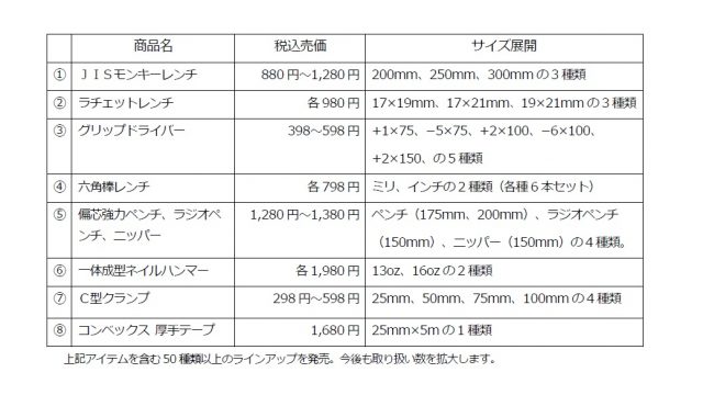 今回発売するのは、「JISモンキーレンチ」3種類、「ラチェットレンチ」3種類、「グリップドライバー」5種類、「六角棒レンチ」2種類など計50種類の工具で、業界初という1年保証が付く。購入から1年以内に不具合があった場合、無償で返品・交換ができる。