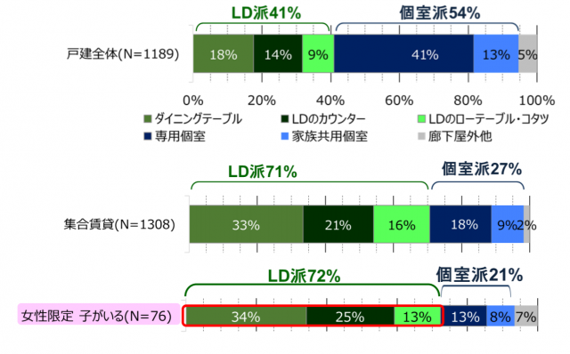 旭化成ホームズ(東京都千代田区)くらしノベーション研究所はこのほど、新型コロナウイルス感染拡大防止に向けた緊急事態宣言発令に伴い急速に普及した、在宅ワークにおけるくらしの現状について調査を実施し、その結果を発表した。在宅ワークをする場所を尋ねたところ、戸建てに住む人では54%が「個室」と回答。「LD」は41%だった。一方、集合賃貸に住む人では「LD」派が71%と、「個室」派の27%を大幅に上回った。子がいる女性に限定すると、72%が「LD」派と、家族のいる空間で仕事をしたい層の存在がわかった。