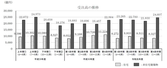2019年度第4四半期(2020年1~3月)の住宅の受注高は前年同期比25.8%減の8327億円。国交省によるとまだ新型コロナウイルスの影響はまだ大きくなく、消費増税や工事の小額化が主な原因という。ただし今後は新型コロナが懸念されるとみている。