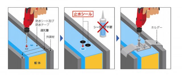 今回のリニューアルでは、建物と一体化した駆体式バルコニーの上部取り付け工程を乾式化。笠木ホルダー部に専用止水部材「止水シール」を使うシーリングレス工法とすることで、省施工と防水を両立する。