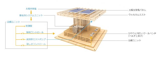 ヒノキ格子が直射日光を遮り、ペルチェ効果(*)を利用した「クールベンチ」に座ることで涼感を得られる。ミストに加え、クールベンチの動力も太陽光発電でまかなう。