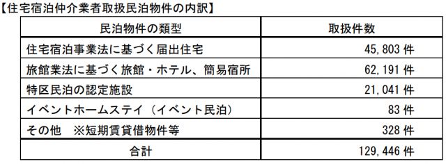 観光庁は6月16日、今年3月31日時点で住宅宿泊仲介業者等が取り扱う民泊物件数が延べ12万9446件になったと発表した。住宅宿泊事業法(民泊新法)施行時点(2018年6月15日)から10万4508件の増加、この半年間では3万2798件の増加となった。