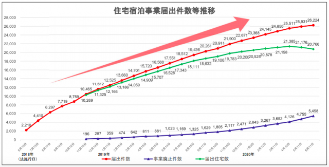 住宅宿泊事業の届出件数は、今年6月11日時点で2万6224件。法施行日時点の約11.9倍となった。