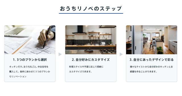 プランは、キッチンリフォームにフォーカスした「A:キッチンだけ」、別の居室リフォームやフルリノベにも対応する「B:おうちまるっと」、物件購入からリノベまでサポートする「C:中古住宅を購入して」の3種類。