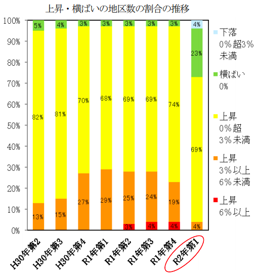 新型コロナウイルス感染症の感染拡大に伴い、多くの地区で需要者の様子見など取引の停滞が見られ、地価の上昇傾向が鈍化。地価動向の変化が大きかった地区では、特にホテル、店舗需要の比重が高かった。