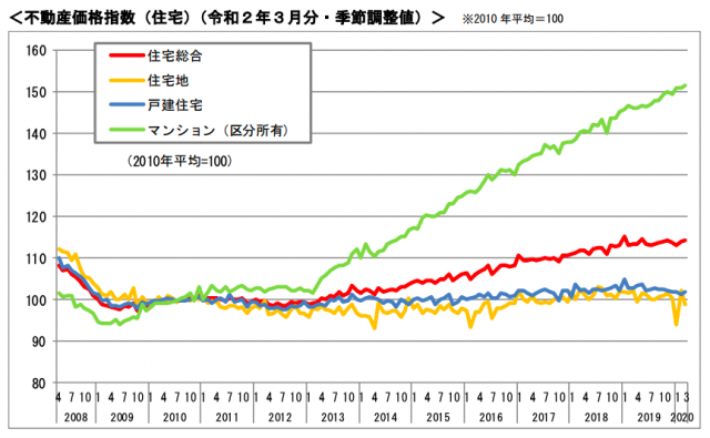 国土交通省は6月26日、今年3月分の不動産価格指数(2010年平均を100として算出)を公表した。「住宅総合」は前月比0.1%増の114.2(前年同月比0.7%増)、「住宅地」は同3.2%減の99.0、「戸建住宅」は同0.8%増の102.0、「マンション(区分所有)」は同0.5%増の151.7だった。