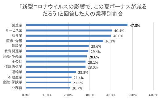 「住宅ローンの返済で、ボーナス払いを選択していますか?」という問いに対し、「はい」と答えた人は37.7%だった。また、「新型コロナウイルスの影響で、この夏のボーナスが減るだろう」と予想した人の多い業種は、製造業(47.8%)、サービス業(40.4%)、飲食業(40.0%)の順だったほか、4番目に医療・介護(36.2%)が続いた。建設業は29.6%、不動産業は21.4%だった。年代別では、若い年代ほど「ボーナスが減る」と予想している人が多かった。