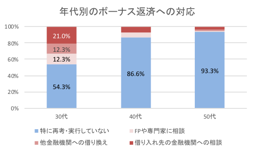 「今の新型コロナウイルスの状況を受けて、ボーナス支払について再考・もしくは実行したことはありますか?」との質問に対して、検討・実行した人は22.8%。対応方法としては「借入先の金融機関への相談」(11.2%)、「FPや専門家に相談」(6.7%)、「他金融機関への借り換え」(4.9%)の順だった。また、検討・実行した人の割合を世代別でみると、世代間で大きな差が見られた。50代が6.7%、40代が13.4%だったのに対し、30代では45.7%と半数近くの人が検討・実行したことが分かった。