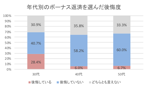 ボーナス払いを選択したことを「後悔している」という人は全体で14.3%となり、30代では約3人に1人(28.4%)が後悔していた。ボーナス払いを選んだ理由で最も多かったのは「毎月の返済額を減らしたかったから」(60.5%)、次いで「定年までに住宅ローンを返済したかったから」(24.2%)となった。