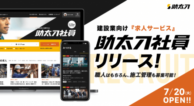 職人と現場のマッチングアプリ「助太刀」を運営する助太刀(東京都渋谷区)は、建設業に特化した求人事業「助太刀社員」を7月20日にスタートする。これにより、「助太刀」で社員の募集が可能になる。