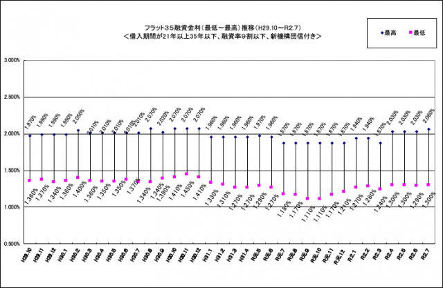 住宅金融支援機構(東京都文京区)が7月1日発表した、各金融機関の長期固定金利住宅ローン「フラット35」の7月分の金利は、主力の融資率9割以下・借入期間21年以上の場合で、年1.30~年2.06%だった。最低金利は3カ月ぶりに上昇した。