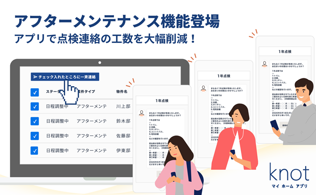 SOUSEI Technology(東京都港区)は7月3日、同社が提供するマイホームアプリ「knot」の新機能として、アフターメンテナンス機能をリリースした。点検予定の管理や顧客への点検連絡がより効率的にできる。