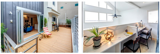 施工事例。家族みんなで過ごせるウッドデッキ(左)と 吹き抜けから家族の声が聞こえ孤立感がないワークスペース(右)