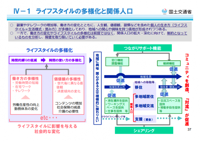 同懇談会では、関係人口の類型化・定量化を試みることで実態を明らかにしつつ、ライフスタイルの変化、シェアリングエコノミーの拡大等を踏まえながら、関係人口の拡大・深化に向けた課題を整理。「人と地域とのつながりによる地域づくり」では、共助のネットワークの形成が必要であることをあげた。「取組が持続可能となる環境の整備」では、人と地域との“つながり”や、シェアリングと地域との“つながり”を支える中間支援組織等が必要とした。「シェアリングを活用した共助システムの構築」では、公的サービスのレベルが低下している地域で、公的な役割を補完する可能性がある協同組合型等のシェアリングが有効であり、活用していくための環境の整備が必要とした。