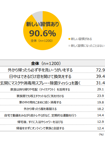 コロナ禍で「新しい生活習慣ができた」割合は90.6%。習慣になったこととしては「外から帰ったら必ず手洗い・うがい」(72.9%)との回答が最も多く、「日中はできるだけ窓を開けて換気」(39.4%)、「玄関にマスクや消毒・除菌ティッシュを置く」(31.4%)と続いた。また、それらの習慣について、87.0%が「継続したい」と回答した。