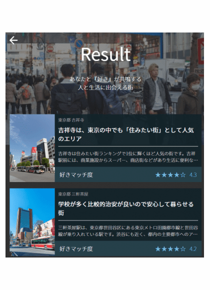 同サービスは、いくつかの質問に答えることによって、個人の生活スタイルに即した「住みたい街」・「好きになれる街」を提案するサービスで、同社が昨年12月に開催した「第3回大学生ビジネスコンテスト」の優勝チームが提案した「“家ではなく、街に住む”ためのスコアリングサービス」を具現化したもの。約1万人の趣味嗜好傾向データと街のデータをかけ合わせて、AIがその人の「住みたい街」・「好きになれる街」を診断し、その結果から、間取りや賃料といった、部屋や家に関する情報につなげていく。
