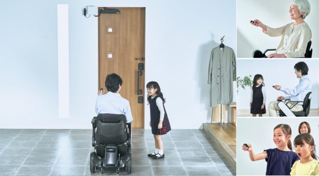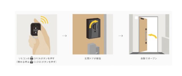 玄関ドアに触れることなく、リモコンのボタンひとつで鍵の施錠・解錠、ドア開閉が可能になるシステム。オートロック機能付きのため、施錠のために振り返る動作が不要になる。