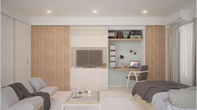 「リモートワーク賃貸」は、在宅勤務に対応したワンルームの賃貸アパート。室内にはデスクが設置されており、電源・USB充電設備、Wi-Fi環境も整っているため作業に集中できる。スライディングウォールを閉めワークスペースを隠すことも可能。また、ウイルスとの共存を背景に、感染リスクや不安を低減するため、抗ウイルス・抗菌作用を持つ建材や空気環境デバイスなどを採用している。