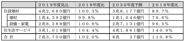 また、2030年度の同市場は、2018年度比10.8%増の8兆37億円と予測する。内訳は、住設建材が同10.3%減の3兆8177億円、住生活サービスが同40.9%増の4兆1861億円。住設建材の内訳は、建材が同23.4%減の1兆1046億円、設備・家電が同3.5%減の2兆7131億円。