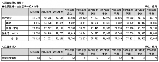 同市場では、暮らし方や働き方の多様化と、住宅に求められる機能の高度化により、IoTの活用や住生活サービスとの連携で快適な暮らしを提案する「コト売り」へ市場が変化。サービス展開まで視野に入れた製品の開発が重要になる。注目市場の住宅用電気錠については、2019年度が2018年度比3.6%増の57億円の見込み、2030年度が同27.3%増の70億円と予測する。