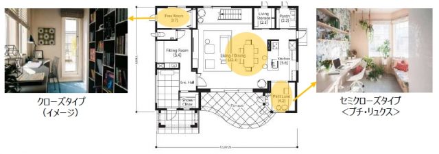 フランス語で「小さなぜいたく」を意味するセミクローズのテレワークスペース「プチ・リュクス」の他、入口に扉を付けるクローズドタイプも用意している。キッチンと連続した場所に設置し、家事の合間に作業ができるように設計。ダイニングルームの活用も想定している。共働きに対応できるよう、複数のテレワークスペースを提案する。