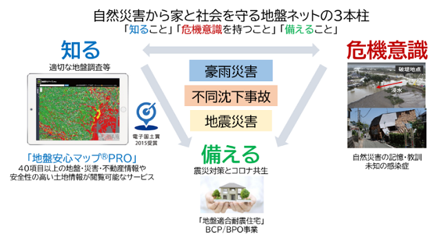 同サービスは、40項目以上の地盤・災害・不動産情報や安全性の高い物件情報をひとつに集約したもので、誰でも簡単に地盤・土地情報を把握可能。土地の特性から被害を予測し、復興への建て替えや住み替え、今後の自然災害への対策に活用することができる。2016年にリリース以降、500社以上の住宅サービス事業者が利用している。