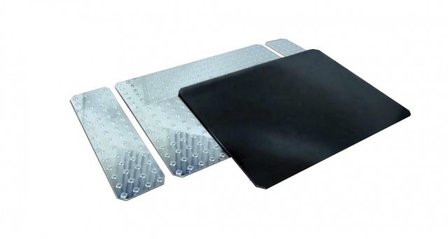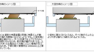 「ミューソレーター」は、ステンレスと特殊樹脂鋼板の2枚を使い、既存の床に敷くだけで免震性能をもたせる後付け免震システム。オフィスや倉庫、展示ケースなど面積の大小を問わずに設置でき、阪神大震災クラスの地震を震度4程度に軽減することが可能という。工期は2~3日(500m2のフロア全面に敷設した場合)。