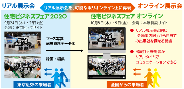 オンライン展示会は、9月に開催される各展示会の展示ブースや出展製品の画像、講演・セミナーの動画をオンラインで閲覧できる。出展社とウェブ上でリアルタイムに商談できる機能も備えている。