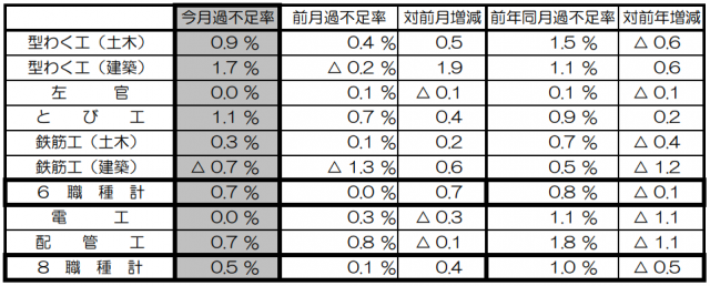 職種別の状況では、鉄筋工(建築)以外の職種で不足となった。不足が最も大きかったのは型わく工(建築、1.7%)だった。地域別では、近畿と沖縄で均衡、中国と九州で過剰、北海道、東北、関東、北陸、中部、四国で不足となった。不足率の最大は北海道(2.7%)、ついで中部(2.2%)、北陸(1.0%)、東北(0.7%)、四国(0.4%)、関東(0.1%)となった。