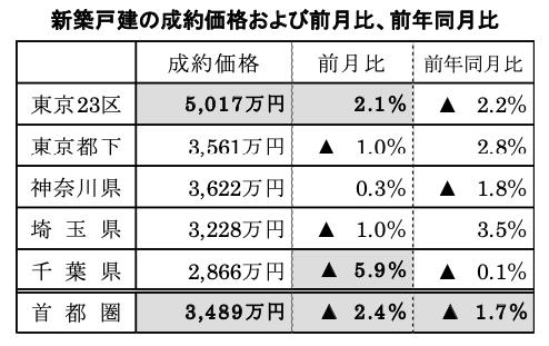 下落の主因としては、千葉県で3000万円以上の価格帯の割合低下、平均敷地面積の縮小などから前年同月比5.9%の下落となったことが影響した。一方で、東京23区の成約価格は5000万円以上の価格帯の割合上昇などによって前月比で2.1%上昇し、4カ月ぶりに5000万円を超えた。