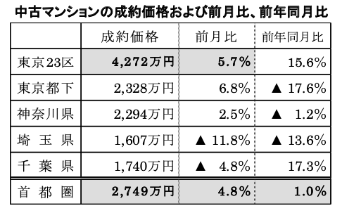 中古マンション成約価格の平均は2749万円。前年同月比で1.0%上昇し、5カ月ぶりのプラスとなった。前月比は4.8%上昇した。前月比の上昇は、東京23区で平均占有面積の拡大などにより5.7%のプラスとなったことが主に影響した。東京23区の成約価格は前月に続いて4000万円を超え、2009年1月の調査開始以来2番目の高水準となっている。