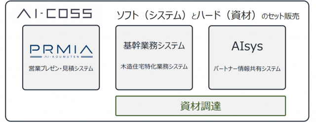 「AI-COSS」は、ソフトとハード、双方から総合的に工務店の支援を行うシステムで、営業プレゼンから見積もり、業者への受発注、経営管理までを一元管理できる仕組みとなっている。ソフト面では、商談のスピードアップを図る営業支援システムや見積もりシステムなど、同社のナレッジ・ノウハウが詰まったITシステムを提供し、ハード面では、同社が構築した資材調達網を活用した建築資材の共同購買システムを提供する。