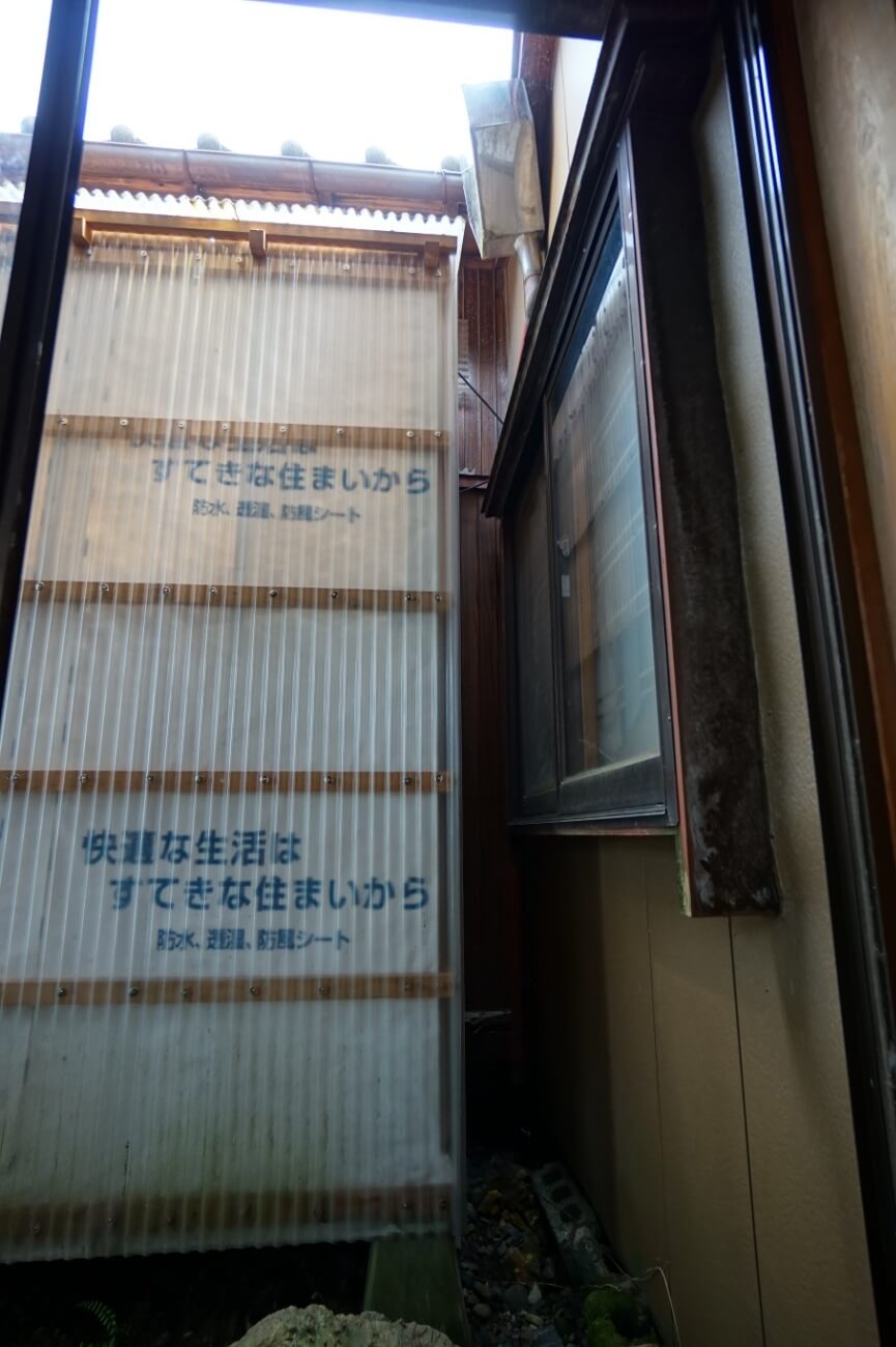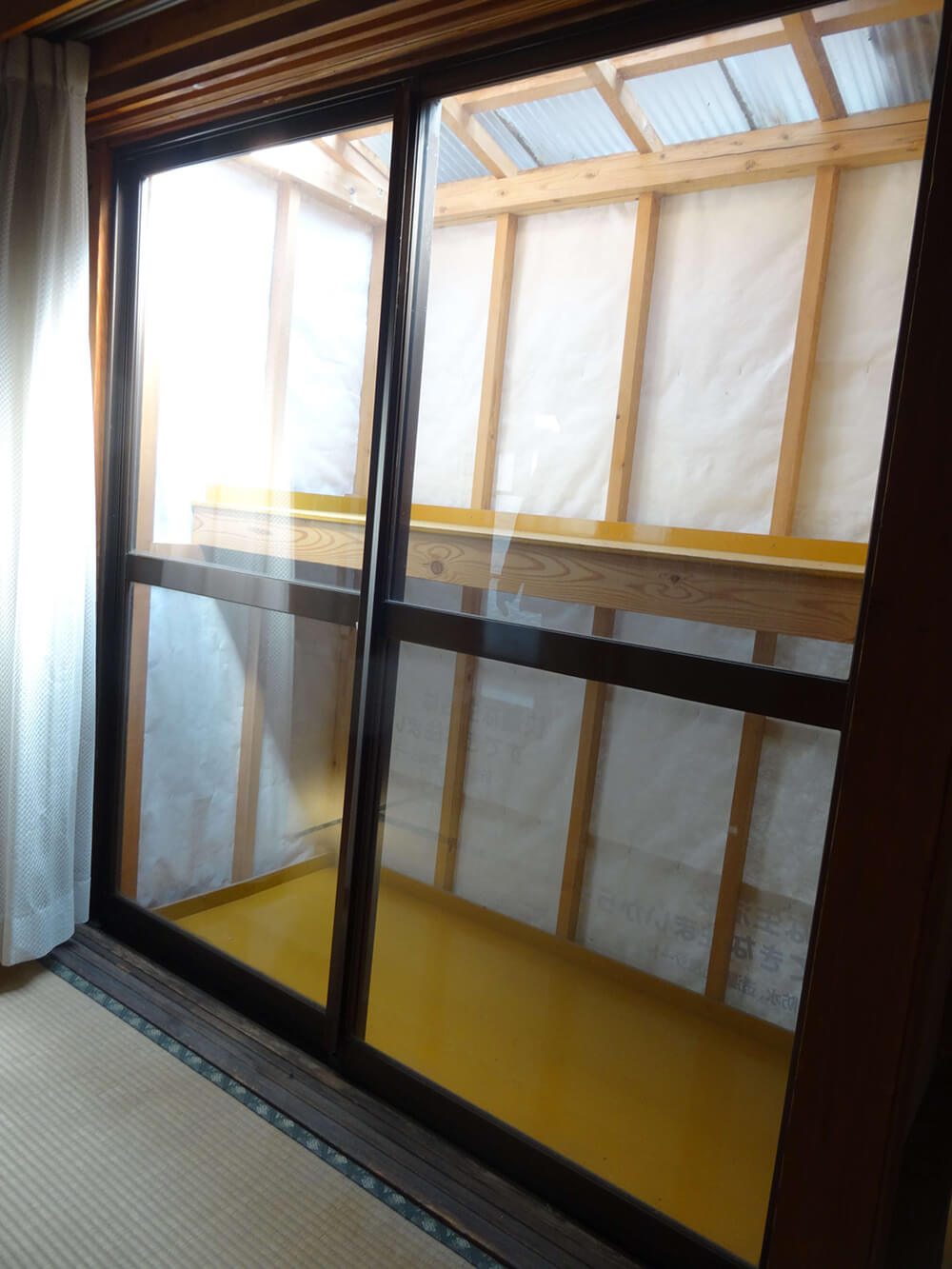 - サンルームの詳細。塗装合板と透湿防水シートで囲っただけの簡易なつくり