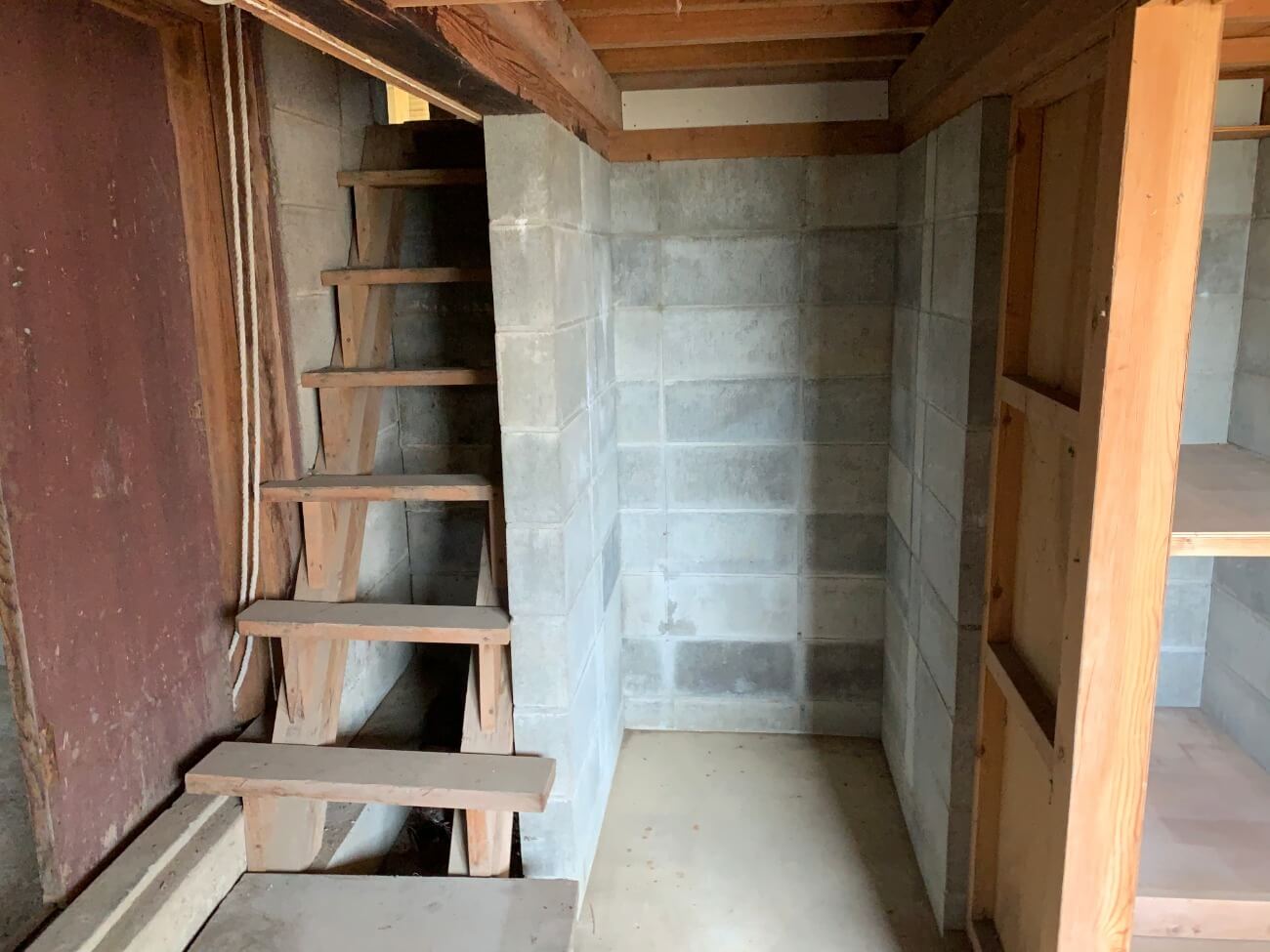 これらに加えて、この物件には広いブロック造の地下室があった。地下室は増築部分と倉庫の下部全体に及び、天井高も2メートルほどあった。敷地が斜面地だったことから倉庫を建てたときに地下を設け、住宅部分を増築するときにそれを延ばして広げたようだ。